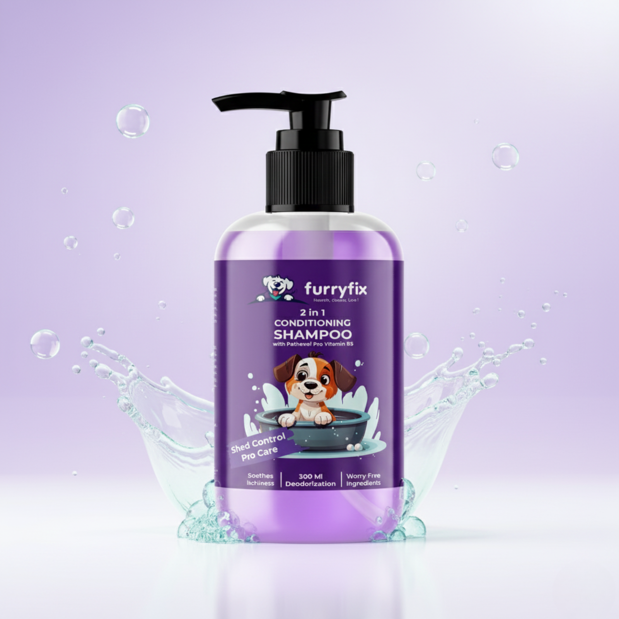 Premium 2-in-1 conditioning shampoo featuring our luxurious Pro Care Edition with Panthenol Pro Vitamin B5. Designed with a sophisticated purple aesthetic that communicates professional-grade pet care for shed control and skin nourishment.